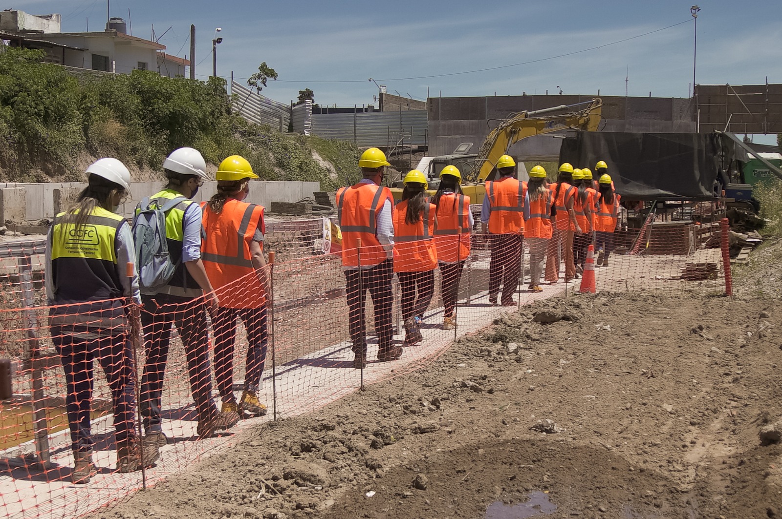 En segundo lugar, se visitaron las obras del Ferrocarril Central en Capurro. Allí se pudieron observar todas las etapas de construcción de las trincheras. Esto último está conformado por túneles por donde pasa el tren, pero no tienen techo. Allí guió la recorrida la Ingeniera Noelia Lapaz, jefa de producción de todo el tramo que ocupa un poco más de un kilómetro.