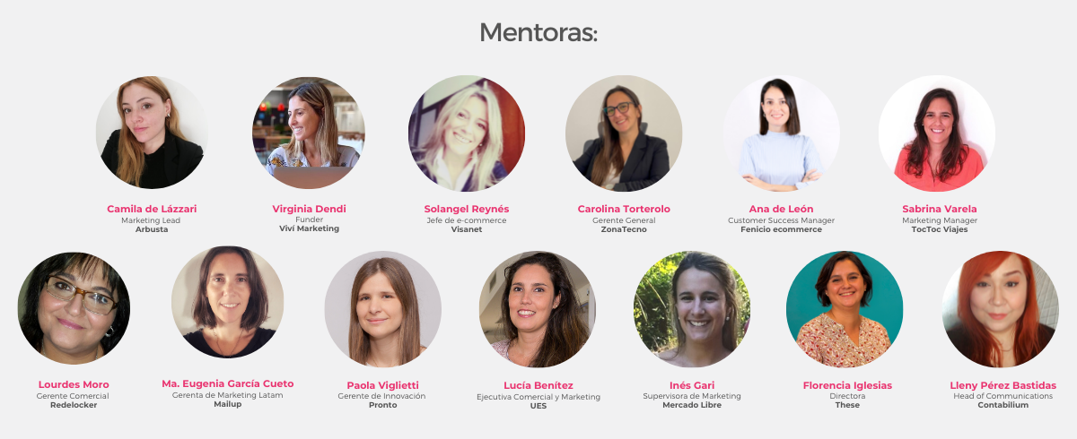 En esta oportunidad, las mentoras serán Camila de Lázzari, Marketing Lead de Arbusta; Virginia Dendi, fundadora de Viví Marketing; Solangel Reynés, jefe de eCommerce de Visanet; Carolina Torterolo, gerente general de ZonaTecno; Ana de León, Customer Success Manager de Fenicio ecommerce; Sabrina Varela, Marketing Manager de TocToc Viajes; Lourdes Moro, gerente comercial de Redelocker; María Eugenia García Cueto, gerenta de Marketing Latam de Mailup; Paola Viglietti, gerente de Innovación de Pronto; Lucía Benítez, ejecutiva comercial de UES; Inés Gari, supervisora de Marketing de Mercado Libre; Florencia Iglesias, directora de These; y Lleny Pérez Bastidas, Head of Communications de Contabilium.