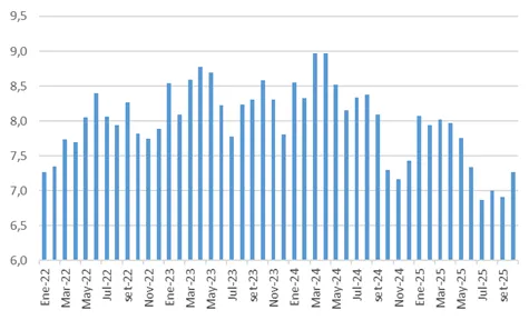 Según el INE, en octubre la tasa de desempleo se ubicó en 7,3%, lo que equivale a unas 138,8 mil personas sin trabajo y en búsqueda activa. El dato implica un aumento de 0,4 puntos porcentuales respecto de setiembre (6,9%), pero se mantiene prácticamente en el mismo nivel que en octubre de 2024. En resumen: el desempleo subió en la comparación mensual, pero muestra estabilidad en la interanual.