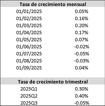 En el transcurso del año 2025 se registraron variaciones de diversa magnitud, incluyendo cambios de signo, en la tasa de crecimiento del componente tendencia-ciclo. En los primeros meses del año, el crecimiento tendencial del IMAE fue positivo, alcanzando su máximo en marzo, para posteriormente reducirse hasta volverse negativo. La tendencia continuó creciendo en los primeros cinco meses del año, hasta detenerse y caer marginalmente entre junio y agosto. En setiembre se ha revertido parte de esta caída.