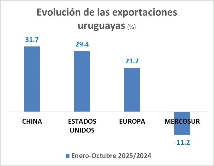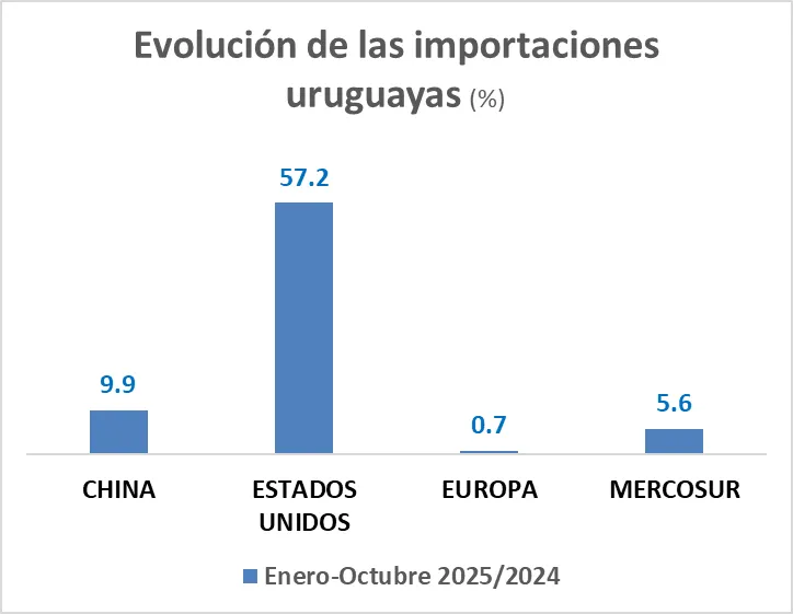 Por su parte, las importaciones uruguayas también mostraron un aumento, que en su caso fueron, a octubre, de 4.1% sobre el año 2024. El principal crecimiento de las importaciones fue el de las provenientes de Estados Unidos (57.2%), seguido de las de China (9.9%) y del Mercosur (5.6%).