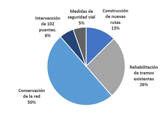 En materia de nuevas obras en el área de carreteras y obras complementarias, el MTOP presentó en el año 2025 el plan de lo que se prevé ejecutar en el actual período de gobierno, con énfasis en conectar y completar la malla vial del país para apoyar el desarrollo productivo, económico y social. Estas se concentran mayoritariamente en el mantenimiento de la red vial existente, con un 50% destinado a conservación y un 26% a rehabilitación de tramos, lo que en conjunto representa el 76% del total (ver Gráfico 1).