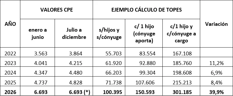 De acuerdo con lo establecido en el Decreto de fecha 26 diciembre del 2025 aún sin numerar, se ajustó la metodología de cálculo del CPE llevando su valor de $ 4.828 (diciembre 2025) a $ 6.693 (enero 2026), lo que implicará un aumento en los aportes de los trabajadores dependiendo de sus ingresos, el tipo de relación laboral y la situación familiar.