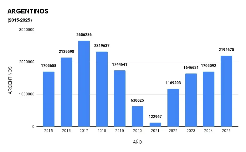 Los principales mercados emisores continuaron siendo Argentina y Brasil. Argentina se consolidó como el de mayor presencia, con 2.403.720 ingresos y un gasto total de US$ 1.175 millones. Se destaca que la llegada de argentinos fue la mayor desde los máximos registrados en los años 2017 (2.656.286 visitantes) y 2018 (2.319.637).