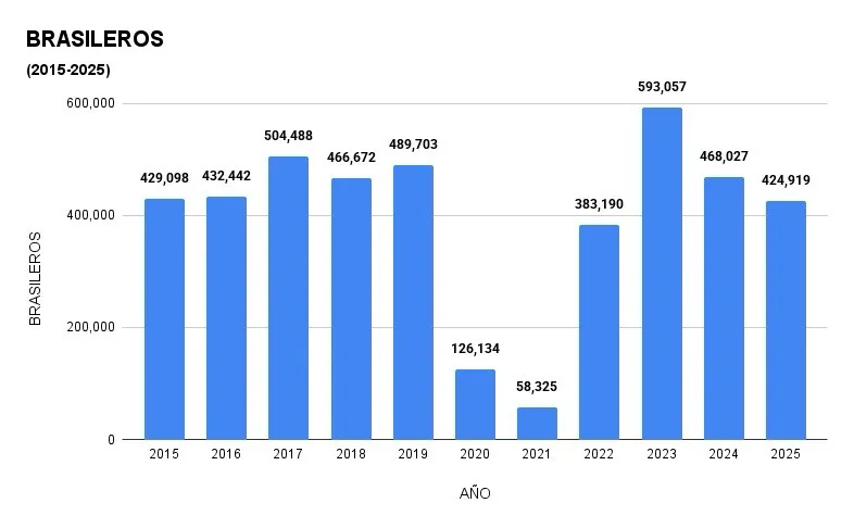 En segundo lugar, se ubicó Brasil, con 489.677 visitantes, cuyo gasto estimado alcanzó los US$ 336 millones. Pese a los buenos números, se constata el segundo año de caída consecutiva en la llegada de turistas brasileros, tras el pico alcanzado en el año 2023 cuando ingresaron 593.057 personas de esa nacionalidad.