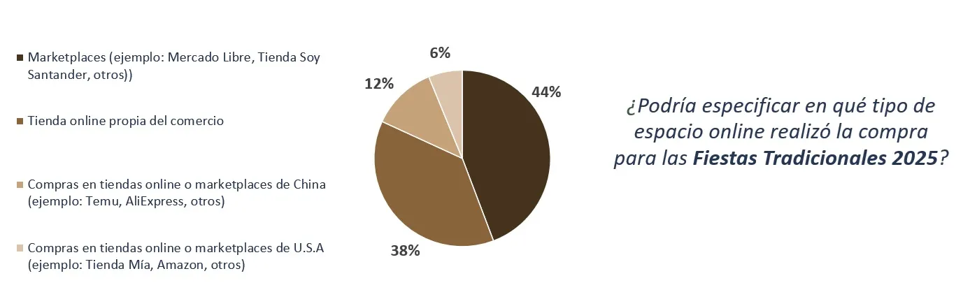 Por su parte, entre las personas que realizaron la compra online, un 44% lo hizo a través de marketplaces a nivel local, seguido por las compras realizadas en la tienda online propia del comercio (38%). Por su parte, las compras en marketplaces de China alcanzan un guarismo del 12% (aumentando 4 puntos porcentuales respecto al 8% de 2024), mientras que la participación de los marketplaces de EEUU se mantuvo en el orden del 6%. De esta forma, las compras en tiendas online o marketplaces del exterior tuvieron una participación del 18%.