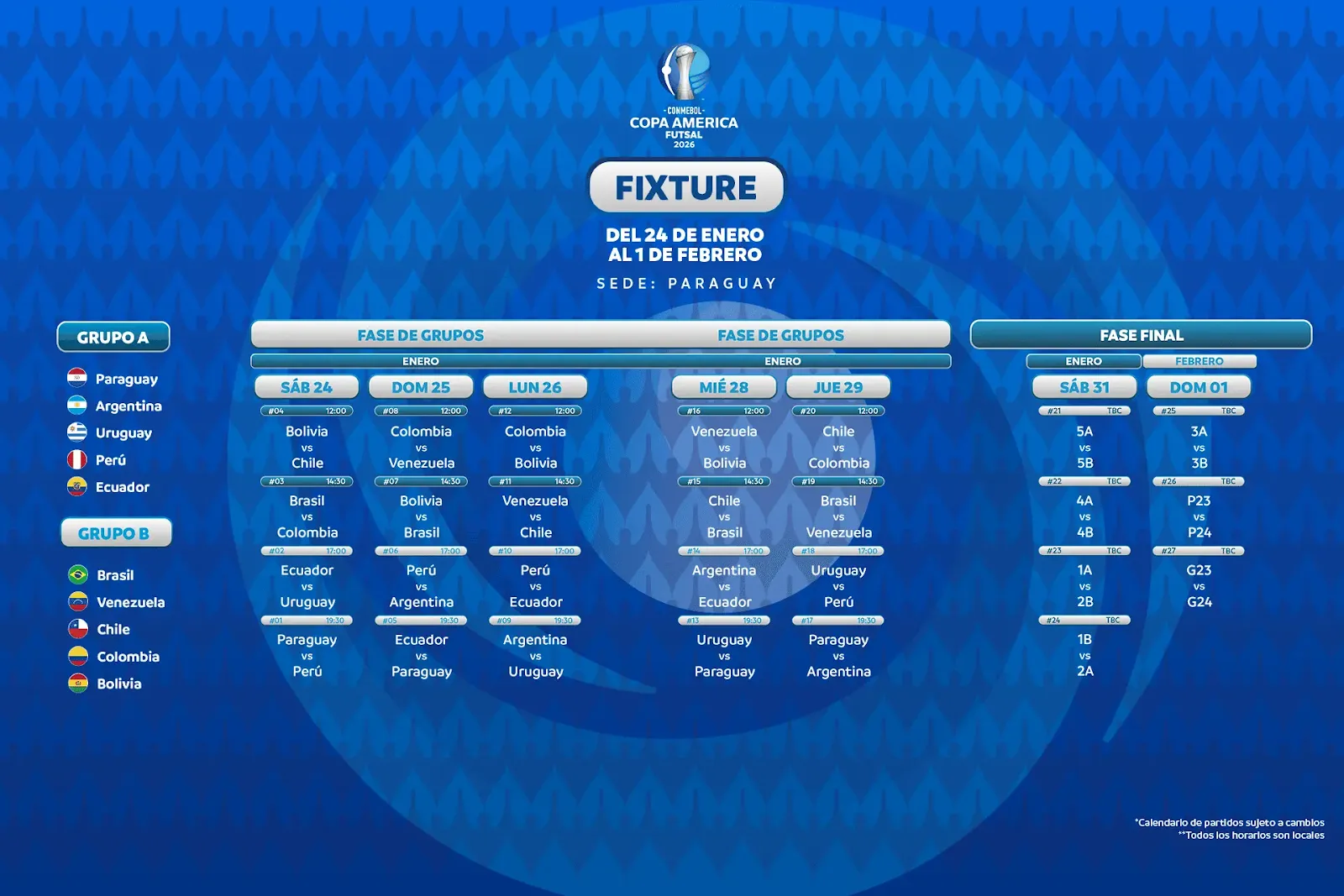 Paraguay, en su condición de anfitrión, lidera el Grupo A, que también integran Argentina, Perú, Uruguay y Ecuador. En tanto, el Grupo B estará conformado por Brasil, Bolivia, Chile, Colombia y Venezuela. Brasil llega al torneo con el objetivo de defender el título obtenido en la edición 2022.