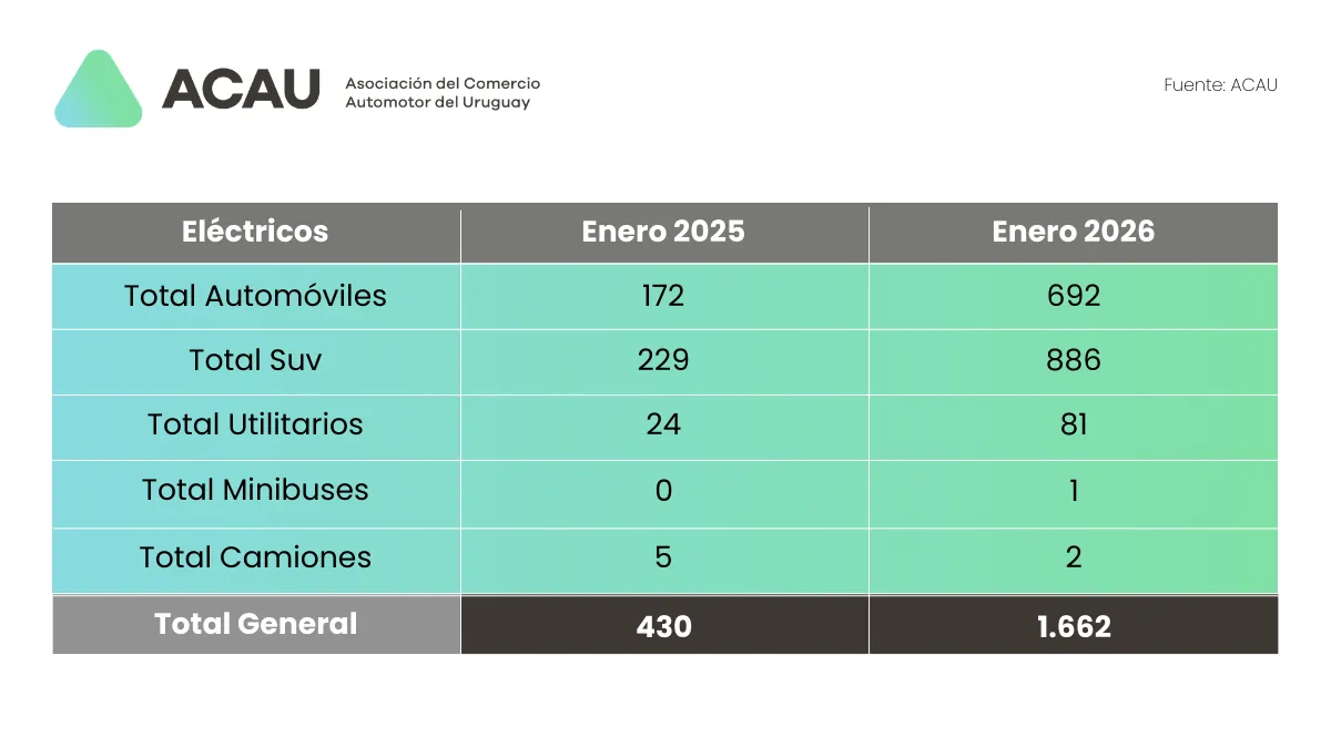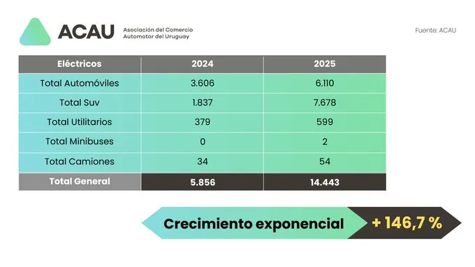 Según datos difundidos por la Asociación del Comercio Automotor del Uruguay (ACAU), durante 2025 se vendieron 14.443 vehículos eléctricos, lo que equivale a un crecimiento del 146,7% en comparación con 2024, lo que ubicó a esta categoría como un jugador central en el mercado.