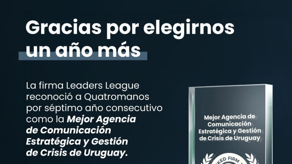 Por séptimo año consecutivo, Leaders League, el prestigioso grupo francés que recoge la opinión de líderes empresariales de cada país en 40 naciones, ha reconocido a Quatromanos como la Mejor Agencia de Comunicación Estratégica y Gestión de Crisis de Uruguay.
