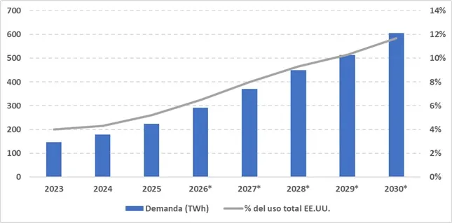 Gráfico 1 - Crecimiento de la demanda eléctrica de centros de datos en EE.UU. (2023–2030)