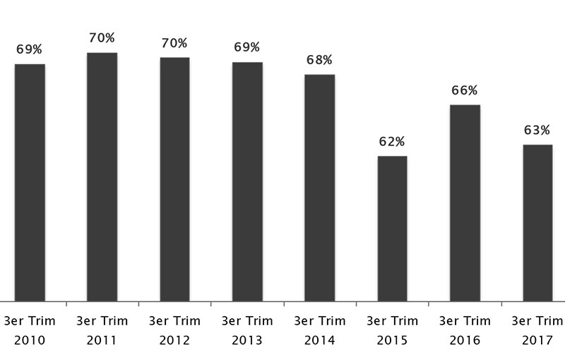 Durante el tercer trimestre del año, la industria utilizó el 63% de su capacidad instalada, apenas un punto superior al mínimo histórico alcanzado en igual trimestre de 2015, pero tres puntos porcentuales por debajo de igual trimestre de 2016. Este aumento de la capacidad ociosa va en línea con la desaceleración de la producción industrial de los últimos meses.