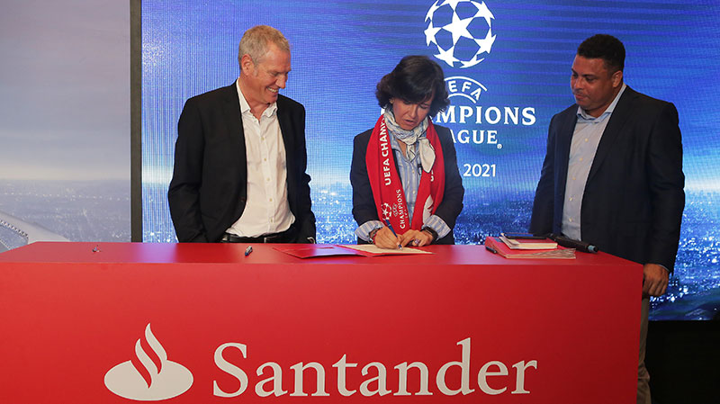 La presidenta de Banco Santander, Ana Botín, y los responsables de país de los diez principales mercados del banco firmaron el acuerdo en Brasil, junto con un representante de la UEFA. El acto contó con la participación de Ronaldo y recibió un saludo por video del histórico Pelé.