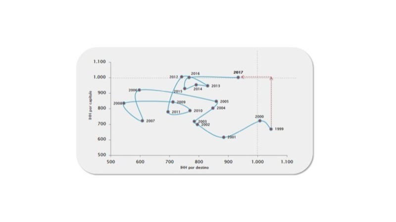 Las exportaciones uruguayas de bienes, valuadas en dólares corrientes e incluyendo las colocaciones de zonas francas, mostraron un importante dinamismo durante los diez años siguientes a la crisis de 2002 (a excepción de 2009 debido al deterioro de la coyuntura internacional). Posteriormente, las mismas permanecieron relativamente estables, en niveles elevados en la comparación histórica, para luego verificar una notoria caída a partir de 2015. Sin embargo, en el último año se observó una recuperación en las ventas externas del país. Según el Informe Anual de exportaciones de bienes del Uruguay del 2017, en volúmenes físicos, si bien se registra cierta caída en 2011, los niveles de exportación se mantuvieron relativamente estables hasta 2016, registrando un nuevo aumento en 2017. La contribución de las colocaciones externas al Producto Interno Bruto permaneció en el mínimo valor desde 2002 (15%), pese a la desaceleración del crecimiento económico de los últimos años. Por su parte, se destaca la importancia que han adquirido en los últimos años las ventas externas de Uruguay desde las zonas francas. Cabe señalar que en el análisis se incluye el ajuste de exportaciones de madera (capítulo 44 del S.A.) con destino a UPM y Montes del Plata, y productos químicos (partidas 2918, 2922-2924, 2932-2941 y capítulo 30 del S.A.) con destino a Mega Pharma. Mientras que hace una década las exportaciones de Uruguay desde zona franca representaban el 8% del total de bienes exportados por el país, en 2017 la participación alcanzó el 22%. Este incremento se explica principalmente por la mayor actividad de la empresa Montes del Plata, que comenzó a producir a fines de 2014 y representa el 40% de la oferta exportable desde territorio franco. El resto de las colocaciones externas de empresas instaladas en zonas francas se reparte entre la producción de UPM (30%), Pepsi (23%) y Mega Pharma en Parque de las Ciencias (6%), la cual comenzó a exportar en 2016. A continuación, se presenta el Índice de Herfindahl - Hirschman (IHH), que mide el grado de concentración o diversificación de las exportaciones por producto (en relación a los capítulos del Sistema Armonizado) o por mercados de destino. El índice varía entre 0 y 10.000, implicando que cuanto mayor es el resultado, mayor es la concentración. Se establece que si el resultado es superior a 1.800 la concentración es alta, entre 1.000 y 1.800 la concentración es moderada y si el resultado es inferior a 1.000, no se considera que las exportaciones estén concentradas. Al analizar ambas dimensiones, se observa que en 2017 la concentración de mercados y productos ha sido de las más altas contando desde 1999. Respecto a 2016 se mantuvo la concentración por productos y aumentó por destino, por la creciente participación de China en las exportaciones. En línea con lo anterior, se puede observar que en los últimos seis años más del 60% de la oferta exportable nacional –sin incluir las zonas francas- se concentra en tan sólo cinco productos de origen primario (carne, soja, madera, lácteos y cereales). Por tanto, el desempeño exportador del Uruguay está fuertemente influenciado por dichos commodities, que son muy vulnerables a los shocks de oferta y demanda externos. La creciente importancia de los productos primarios en la oferta exportable del país explicó en parte la pérdida de la participación de las exportaciones industriales en los últimos años. Las mismas pasaron de representar el 79% de las exportaciones de bienes en 2001 al 64% en 2017, tendencia que se profundizó en el último año, ya que el aumento de las exportaciones resultó mayor en el caso de los productos primarios. Por otro lado, si bien en el período 2001-2017, las exportaciones de Manufacturas de Origen Industrial (excluyendo la devolución de aviones desde el año 2014) ganaron participación en relación a las Manufacturas de Origen Agropecuario, esto se debió al importante aumento de las ventas externas de pasta de celulosa de UPM y Montes del Plata. Sin embargo, al excluir los bienes exportados desde territorio franco, la gran mayoría de las exportaciones industriales están basadas en materias primas agropecuarias, en detrimento de aquellos bienes producidos en base a materia prima de origen industrial. En 2017, las colocaciones de MOA alcanzaron una participación récord de 74%, destacándose las ventas de carne, productos lácteos, cebada malteada y cuero. Carne y sus subproductos permaneció como el principal rubro de exportación en 2017, participando en el 49% de las colocaciones de MOA y en el 22% del total de la oferta exportable del país. En términos de volumen físico, la venta de carne al exterior alcanzó el máximo nivel de los últimos diez años, y el monto exportado en dólares corrientes verificó un incremento del 7% en el último año. China continúa siendo el principal mercado de destino de la carne uruguaya, con una participación que aumentó cinco puntos porcentuales en 2017 (41%), en detrimento de Estados Unidos (11%). Por detrás se ubican Holanda (10%), Israel (7%), Brasil (6%) y Alemania (4%). En 2017, el 46% de las exportaciones de carne se concentró en seis frigoríficos, lideradas al igual que en 2015 por Breeders & Packers, junto con Frigorífico Las Piedras (9%). Por su parte, Frigorífico Tacuarembó explicó el 8% de las colocaciones de carne al exterior, mientras que Pulsa y Frigorífico Canelones representaron el 7% de las mismas. Completa la lista el Frigorífico San Jacinto, con una participación del 6%.