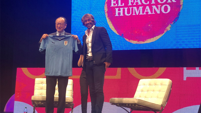Evidentemente a “la Tota” se le veía más cómodo con pantalones cortos, a los pechazos en el área contra los rivales buscando una pelota dividida, que como orador en un seminario sobre capital humano. El último tramo de la disertación consistió en una charla “mano a mano” entre el presidente del BM y el ex capitán de la selección uruguaya Diego Lugano. Ambos trancaron fuerte y se desafiaron mutuamente.