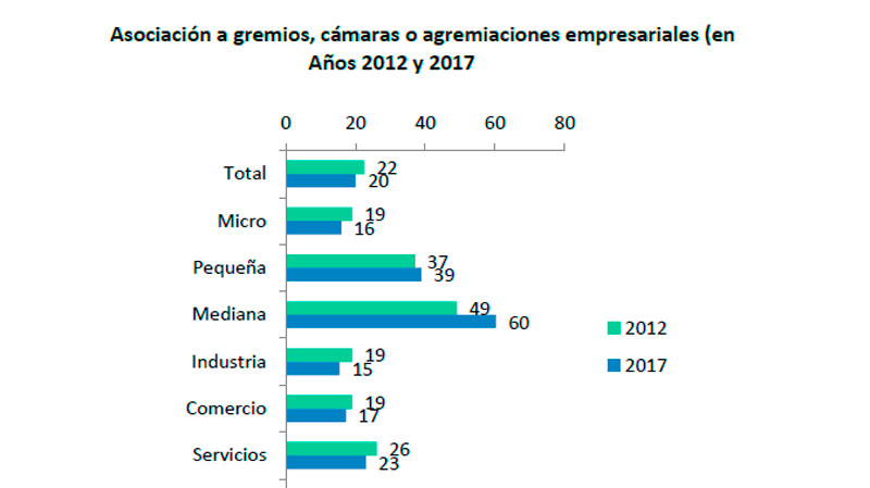 Asimismo la encuesta arroja otros datos como que el grado de asociatividad es mayor entre las empresas que han innovado (33 %) y entre los empresarios hombres (28 %). Por nivel educativo se advierte que el nivel de asociación cae a 13% entre aquellos empresarios con primaria como máximo nivel educativo, y crece hasta 39 % en el caso de los empresarios con nivel educativo de posgrado. Entre las empresas que han vendido al Estado, el nivel de asociación también crece para ubicarse en el 33 %. En tanto, para las mipymes exportadoras los niveles de asociatividad alcanzan el 39 %.