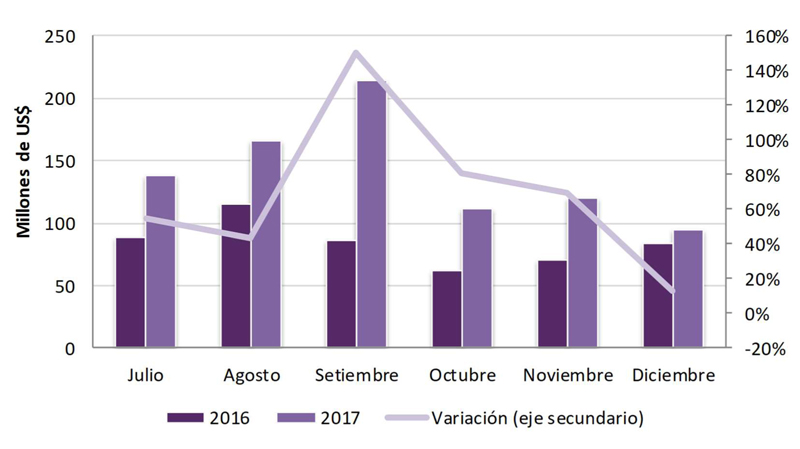 Durante julio-diciembre de 2017, las exportaciones a China le generaron un ingreso de US$ 844 millones a Uruguay, un 67% más que en 2016. Este análisis positivo se puede ver también de manera más detallada: a lo largo del semestre todos los meses presentaron un crecimiento frente al mismo de 2016. La mayor diferencia fue setiembre, donde se vio una variación del 150%. El principal producto exportado, “carne y despojos comestibles”, significó un monto de más de US$ 380 millones.
