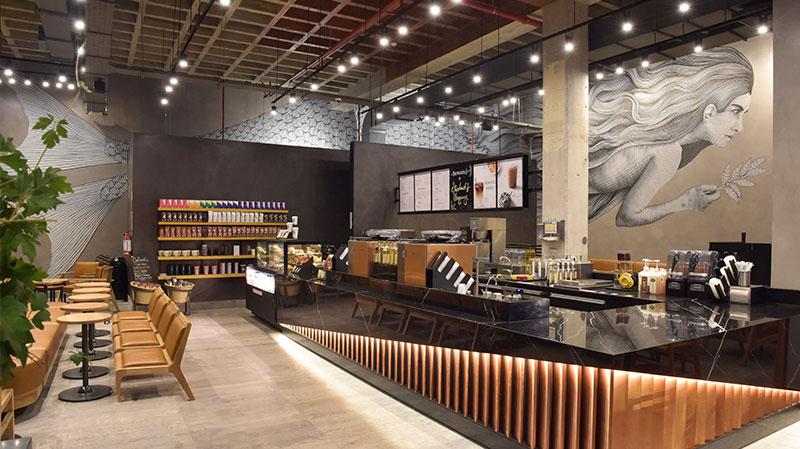 Una de las características más llamativas de la tienda es un mural pintado por Nicolás Alfalfa, un artista local que pudo ilustrar la Sirena, símbolo icónico de la marca Starbucks, sobre un acabado de concreto. La Sirena se extiende por gran parte del local y puede ser observada desde cualquier punto dentro del espacio.