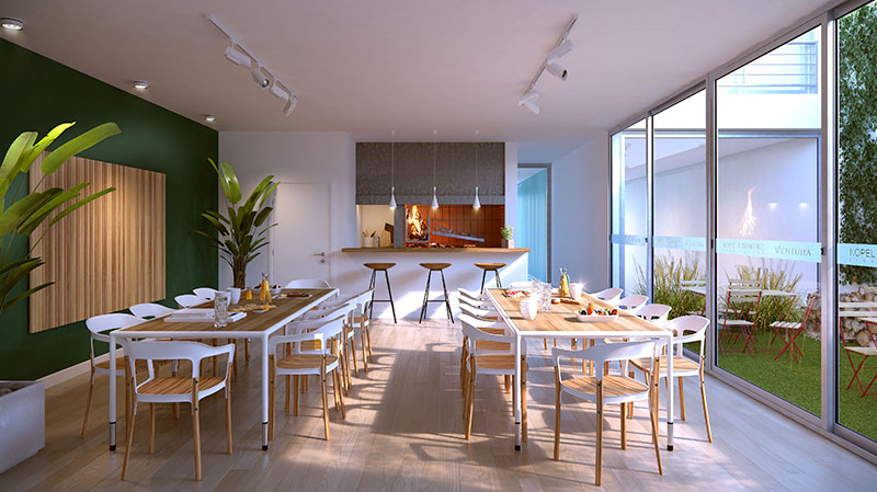 En cada edificio Ventura existe un salón de usos múltiples que la empresa lo transformará en un espacio de encuentro y relacionamiento con vecinos del lugar, tanto de ese como de otros edificios. “Van a compartir momentos allí o salir a correr juntos, por ejemplo, y generar otro tipo de vínculos con alguien que hace lo mismo”, explicó el director.