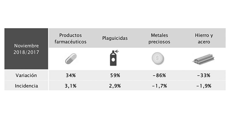 En noviembre de 2018, las solicitudes de exportación de bienes se ubicaron en US$ 639 millones, verificando una caída del 6% respecto a igual mes de 2017. De incluir las colocaciones externas de energía eléctrica realizadas por UTE, dicho monto se situaría en US$ 643 millones.En el acumulado del año, las exportaciones totalizaron US$ 6.944 millones, registrando una contracción del 4% respecto a igual período de 2017. Asimismo, medidas en volúmenes físicos, las exportaciones habrían permanecido relativamente estables en igual comparación (0,5%). Al incluir las ventas externas de las principales empresas instaladas en zonas francas, las exportaciones habrían alcanzado los US$ 8.383 millones en el acumulado a noviembre, permaneciendo relativamente estables en relación a igual período de 2017 (-0,6%). El desempeño negativo de las exportaciones durante noviembre se explicó en gran medida por la disminución en las ventas externas de madera en bruto de eucalipto (subpartida 440398), que cayeron 26% en la comparación interanual e incidieron negativamente en 3,2 puntos porcentuales sobre el desempeño exportador. Se destaca también la contracción en el monto exportado de ganado bovino en pie (subpartida 010229) que descendió 44%, con una incidencia negativa de 2,1 puntos porcentuales sobre el desempeño exportador del mes. Por otro lado, se destaca el aumento en el monto exportado de carne bovina deshuesada fresca o refrigerada (subpartida 020230), que verificó un crecimiento del 16% respecto a noviembre de 2017.Exportaciones industrialesLas exportaciones industriales ascendieron a US$ 489 millones en noviembre, aumentando 6% en la comparación interanual. Considerando el acumulado del año, las exportaciones crecieron 8%. Desagregando por tipo de manufactura, las exportaciones de Manufacturas de Origen Industrial verificaron un leve incremento en la comparación interanual (1%), situándose en US$ 116 millones, acumulando un crecimiento del 5% en los primeros once meses del año. Al distinguir las Manufacturas de Origen Industrial por sector, resulta que las ventas externas de Fabricación de productos farmacéuticos y Fabricación de plaguicidas y otros productos químicos de uso agropecuario fueron las de mayor incidencia positiva en el mes, registrando incrementos del 34% y 59% respectivamente. Entre los sectores que se mostraron menos dinámicos se encuentra Industrias básicas de hierro y acero (-33%), fundamentalmente por la caída en las ventas externas de tubos y perfiles de acero inoxidable (subpartida 730640) realizadas por la compañía Cinter hacia Brasil y de palanquillas (subpartida 720711) por parte de la empresa Gerdau Laisa con destino argentino. Asimismo, se destaca el comportamiento negativo de la rama Fabricación de productos primarios de metales preciosos y metales no ferrosos (-86%), debido principalmente al descenso en las exportaciones de oro (subpartida 710812) por parte de la empresa Loryser con destino a Suiza. Como se comentó anteriormente, el sector farmacéutico verificó un incremento en sus exportaciones en términos interanuales (34%), incidiendo positivamente en 3,1 puntos porcentuales en el desempeño exportador de las Manufacturas de Origen Industrial en el mes de noviembre. Este crecimiento se explica en gran medida por las colocaciones externas de medicamentos (subpartida 300490), las cuales aumentaron 54%, impulsadas fundamentalmente por las ventas de Laboratorio Gador hacia el Líbano. Por su parte, el crecimiento de la división Fabricación de plaguicidas y otros productos químicos de uso agropecuario (59%) se debe principalmente al aumento en las ventas externas de fungicidas (subpartida 380892), por parte de Proquimur hacia Paraguay y Bolivia, y de insecticidas (subpartida 380891), por parte de Compañía Cibeles y Proquimur hacia la región. En cuanto a las Manufacturas de Origen Agropecuario, en el penúltimo mes del año, las colocaciones externas registraron un incremento del 8% respecto a noviembre de 2017, situándose en US$ 373 millones. Considerando el período enero – noviembre, las mismas verificaron un incremento del 10% en la comparación interanual. Cabe destacar el desempeño positivo de las divisiones Producción, procesamiento y conservación de carne y productos cárnicos (19%), Elaboración de productos lácteos (2%), y Elaboración de productos de tabaco (64%), mientras que Elaboración de bebidas malteadas y de malta (-25%) fue el sector que registró una mayor incidencia negativa en términos interanuales. El sector cárnico verificó un crecimiento interanual del 19% y una incidencia positiva de 9,6 puntos porcentuales en las exportaciones de Manufacturas de Origen Agropecuario de noviembre, debido principalmente al desempeño de carne bovina deshuesada fresca o refrigerada (subpartida 020230), destacándose incrementos en las colocaciones con destino a China —fundamentalmente por parte del Frigorífico Carrasco—. El crecimiento del sector lácteo se explica en gran medida por las exportaciones de manteca (subpartida 040510), realizadas principalmente por Conaprole con destino a Rusia y a Emiratos Árabes Unidos. Dentro de la división Elaboración de productos de tabaco, las ventas externas de cigarrillos (subpartida 240220) fueron las más dinámicas, presentando un crecimiento del 128%. Esto se debió en gran medida al incremento de las exportaciones hacia el mercado paraguayo por parte de la empresa Montepaz. Pese a mostrar un comportamiento favorable en el último mes, el sector acumula una caída interanual del 18% en lo que va del año. Por último, en la rama Elaboración de bebidas malteadas y de malta se destaca la reducción de las colocaciones externas de malta sin tostar (subpartida 110710) hacia Brasil por parte de Cervecería y Maltería Paysandú. De todos modos, considerando el período enero   noviembre, las ventas del sector verificaron un crecimiento del 2%.
