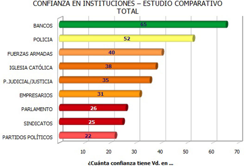 Las cifras arrojan que los bancos lideran la lista de confianza con 65 puntos. Les sigue la Policía, con 52, las Fuerzas Armadas con 40, la Iglesia Católica con 38, la Justicia y el Poder Judicial con 35, los empresarios con 31, el Parlamento con 26 , los sindicatos con 25, y por último los partidos políticos con 22 puntos.