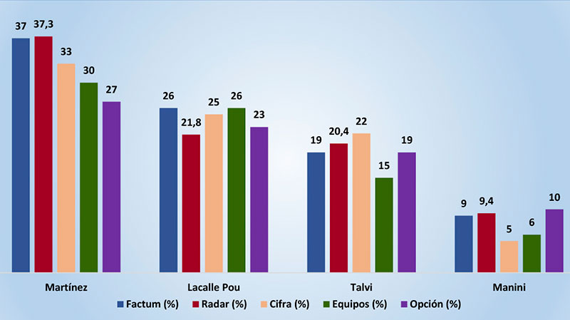 sobre todo, para Lacalle Pou. También impacta al FA, porque no es lo mismo competir contra Lacalle Pou que contra Talvi”, sentenció.Los númerosSi bien desde las encuestadoras se dice que el Frente Amplio (FA) lidera y llegará al balotaje, aún no se sabe cuál será el partido de la oposición que compita por la Presidencia en noviembre.