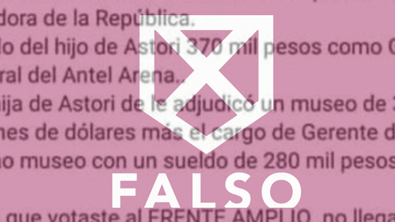 Este texto forma parte de los chequeos periodísticos de Verificado.uy, la coalición de medios de comunicación, academia y sociedad civil creada para combatir la desinformación durante la campaña electoral.Circula en WhatsApp un contenido que afirma que el ministro de Economía, Danilo Astori, su pareja, Claudia Hugo, y sus hijos Danilo y Florencia, cobran sueldos de $480.000, $430.000, $370.000 y $280.000, respectivamente. Sin embargo, esta información es falsa. Ninguno de ellos percibe esos salarios.