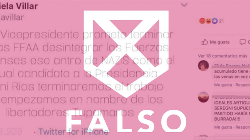Se viralizó en Facebook y Whatsapp la imagen de un supuesto tuit en el que la candidata a la vicepresidencia por el Frente Amplio (FA), Graciela Villar, promete eliminar las Fuerzas Armadas (FFAA). Este contenido, que se replicó centenares de veces por distintas cuentas de Facebook, es falso.“Como vicepresidente prometo terminar con las FFAA, desintegrar las Fuerzas Castrenses, ese antro de nazis como el actual candidato a la Presidencia, Manini Ríos. Terminaremos el trabajo que empezamos en nombre de los libertadores Tupamaros”, dice la publicación.