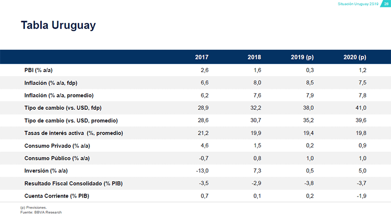 A su vez, tampoco se vislumbra un crecimiento significativo del consumo privado lo que se encadena con un mercado laboral que muestra un alto desempleo (9.5%) y una “continua desaceleración del salario real”, según explicó Haring.ProyeccionesLas convulsiones de la región obligaron a BBVA Research a revisar a la baja las proyecciones para Uruguay también para 2020. “El efecto Argentina se hará sentir no solo en Turismo sino en otros sectores de actividad afectando la demanda externa”, indica el documento.