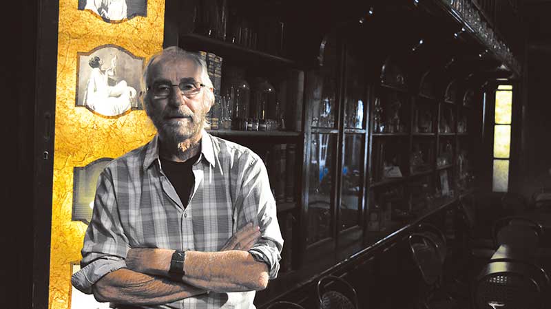 Reyno es escenógrafo de la vieja época. Trabajó en teatros de Europa, en Buenos Aires, en Uruguay y tiene una trayectoria de más de 50 años. Instaló la Vieja Farmacia Solís para no perder el contacto con la gente, siguiendo con la línea de entretenimiento en la que se empleó.