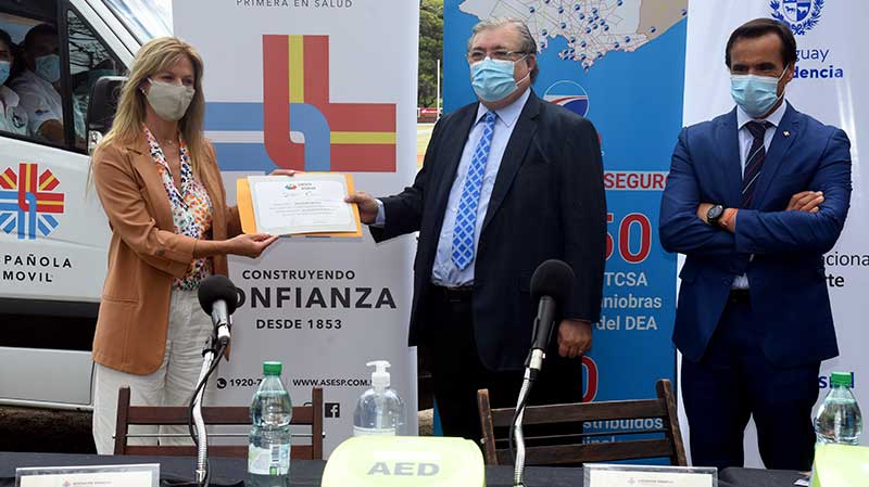 Concretamente, la Asociación Española donó 12 equipos DEA (Desfibrilador Externo Automático) y Española Móvil se comprometió a brindar cobertura médica de Emergencia y Urgencia en las plazas de deporte de Montevideo, el Centro de Entrenamiento de Deportes de Combate y la Pista de Atletismo Darwin Piñeyrúa.