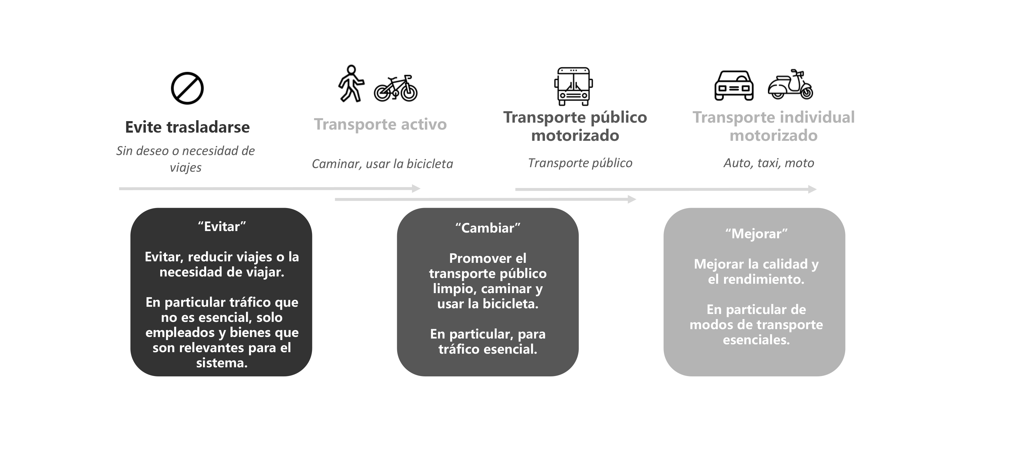 Un enfoque que se ha impuesto en la planificación de la movilidad es el concepto de "Evitar-Cambiar-Mejorar". Estos tres elementos refieren a: evitar viajes o el uso de medios de transporte ineficientes o innecesarios, cuando corresponda, por ejemplo mediante una planificación urbana mixta e integrada, gestión de la demanda de transporte, cadenas logísticas menos complejas y extendidas y opciones de comunicación electrónica (trabajo remoto, compras online); cambiar el modo de transporte por un modo más sostenible, pero también cambiar el viaje en sí mismo, como por ejemplo no viajar en hora pico; y por último, mejorar los sistemas de transporte a través de mejoras tecnológicas, operacionales, regulatorias o de precios e infraestructura que promuevan una movilidad sostenible.