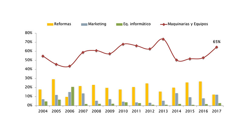 En el monto total a invertir en 2017, Maquinarias y Equipos continúa siendo el principal rubro (64,7%), aumentando su participación en relación a 2016 (53%) y ubicándose por encima de la media histórica (58%). Le sigue en importancia la inversión proyectada en Reformas edilicias (12,3%), Marketing y Publicidad (12,2%), y la adquisición de Equipamiento informático (2,9%).