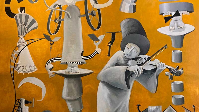Con acceso libre y gratuito, la muestra de Fabián Mendoza puede disfrutarse en el lobby de Hyatt y está abierta todos los días de la semana, durante las 24 horas, para todo aquel que quiera conocerla. Cuenta con cinco obras en las que se percibe el sello personal inconfundible del artista. Con una técnica de pintura al óleo, sus microcosmos están plagados de máquinas, instrumentos, herramientas, vehículos y tipografías en espacios abiertos que no pertenecen a un lugar real o reconocible.