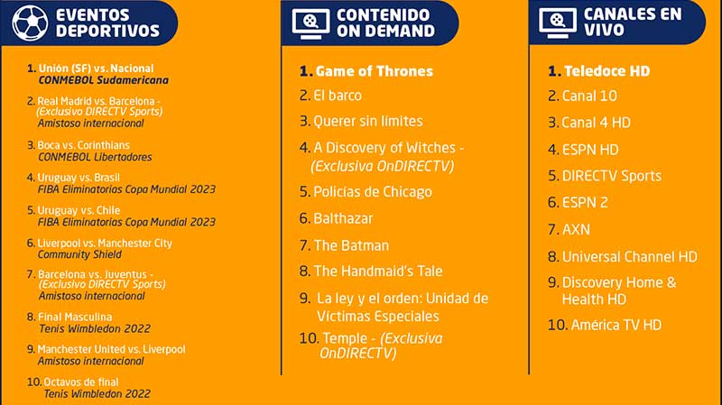 En cuanto al on demand, “Game of Thrones” se mantuvo como lo más elegido por los usuarios, seguida por la película “El Barco” y la serie “Querer sin límites”. Además, se posicionó en el ranking de lo más visto en esta categoría, a nivel local y en la región, la serie exclusiva de OnDirectv "A Discovery of Witches".