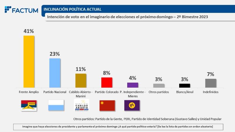 De acuerdo con la última encuesta elaborada por Factum, el Frente Amplio (FA) alcanza el 41% de intención de voto, el Partido Nacional (PN) el 23%, Cabildo Abierto (CA) 11%, el Partido Colorado (PC) 8% y el Partido Independiente (PI) 4%. En tanto, un 3% del electorado optaría por otros partidos, un 3% votaría en blanco o anulado, mientras que un 7% está indeciso.