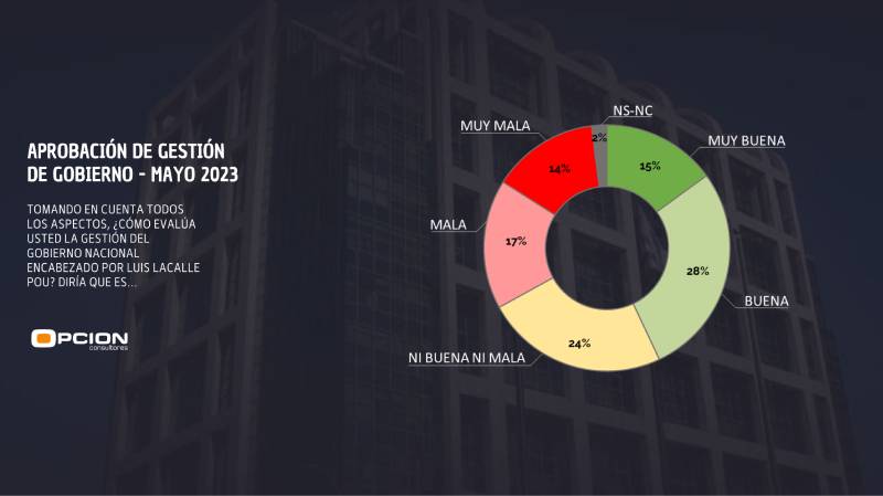 De acuerdo a la última encuesta de Opción Consultores, presentada ayer en Canal 4, el 43% de los uruguayos aprueba la gestión gubernamental en lo que va del período.