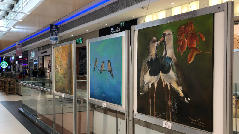 El artista plástico Javier Cruz exhibe una serie titulada “Pájaros de Uruguay”, donde presenta distintas especies nacionales pintadas con acuarela. Por su parte, Karina Carrara utilizó técnicas mixtas para crear obras que, ensambladas a textos de escritores, homenajean a las aves.