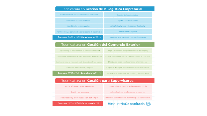 Tecnicatura en Gestión para Supervisores: Esta tecnicatura, compuesta por seis cursos, se focaliza principalmente en la gestión por procesos, eficiencia de la gestión, planificación y presupuestación de tiempos, gestión en la operativa diaria, metodología de resolución de problemas y nociones para el cálculo de costos para supervisores. La misma se dirige a personas que se desempeñan como jefes, supervisores y mandos medios, o que aspiran a desempeñarse como mandos medios.