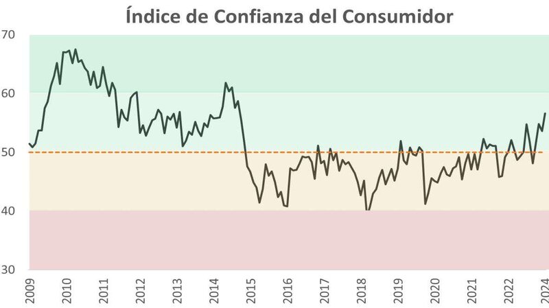 Este aumento en la confianza refleja un moderado optimismo por parte de los consumidores, y se atribuye principalmente a una mayor percepción positiva tanto en la situación personal como en la situación del país. Sin embargo, se observa una disminución en la predisposición a la compra de bienes durables, especialmente automóviles e inmuebles, que cayó 6,1 puntos en términos interanuales.