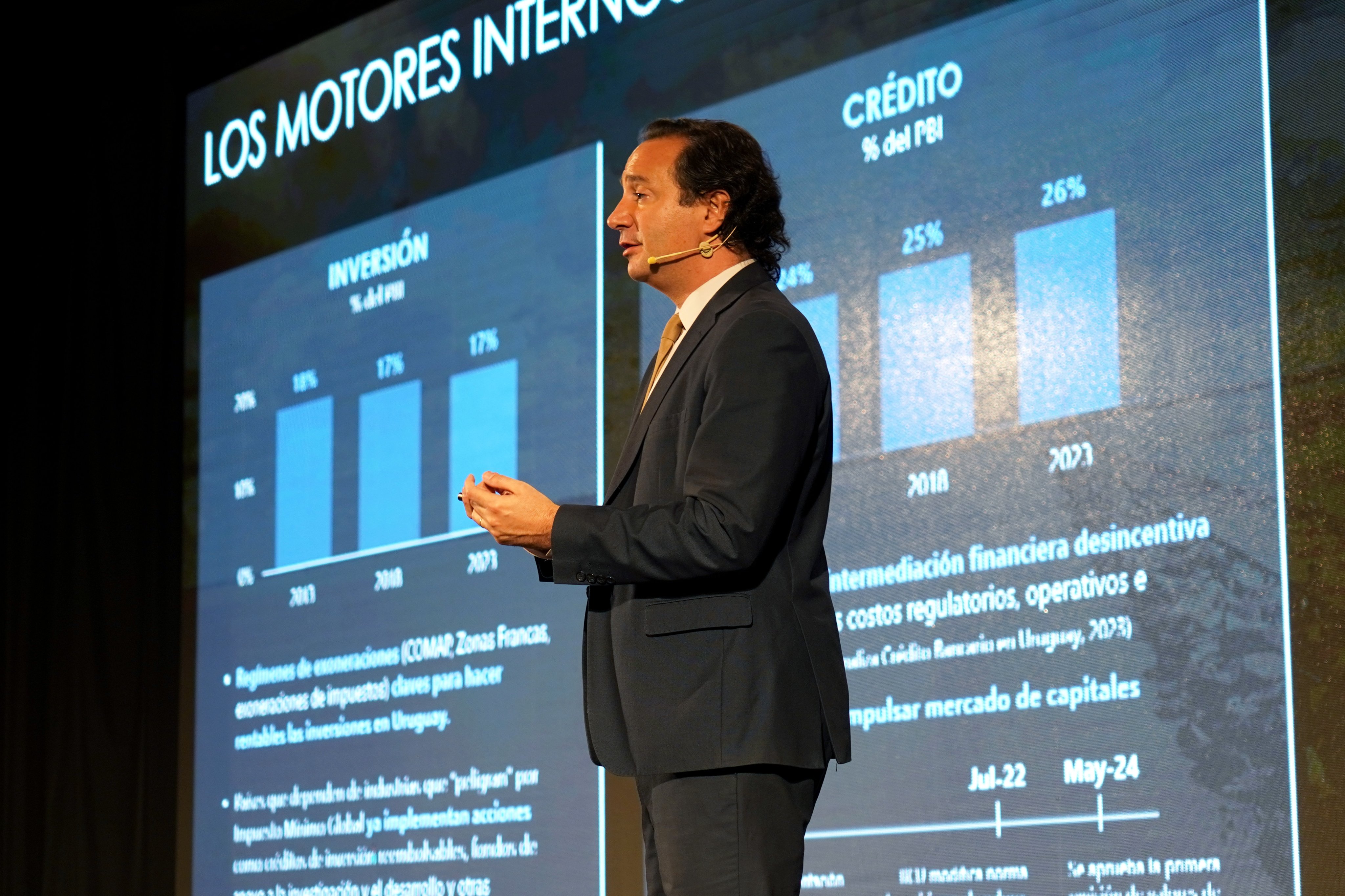 Para el economista, los factores externos "han tenido históricamente enorme importancia" sobre la situación del país. Presentó la realidad actual internacional como "un mundo complicado", con dos conflictos bélicos importantes (refiriéndose a los conflictos Rusia-Ucrania e Israel-Hamás). "Desde 2006 hasta el año pasado aumentó un 24% el gasto militar en términos reales, cosa que no se veía desde hace mucho tiempo" a nivel mundial, informó. Los precios de exportación de los productos uruguayos típicos, si bien superiores al quinquenio 2014-2019, están por debajo de los máximos alcanzados entre 2020 y 2023, por lo cual "no hay una conjunción de precios internacionales que favorezcan nuestra exportación".