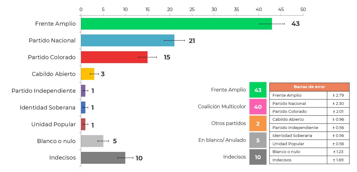 Equipos Consultores relevó los datos estadísticos de intención de voto de los uruguayos en setiembre, que sugirieron un 43% para el Frente Amplio (FA) y un 40% para la Coalición Republicana (CR). Se identificó un crecimiento bastante pronunciado del Partido Colorado (PC) y un aumento de votos en blanco, que estarían en 5%. Entre los indecisos, que son un 10%, se estudió su composición demográfica y no se encontraron grandes diferencias por sexo, edad o estatus socioeconómico.