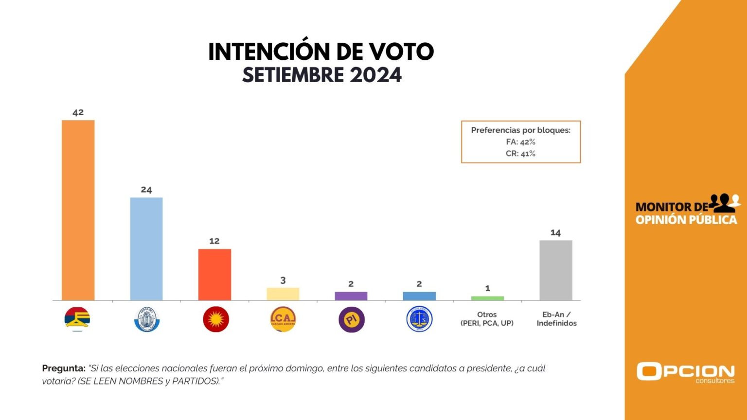De acuerdo con los datos de la última encuesta de Opción, un 42% del electorado votaría al Frente Amplio, mientras que los socios de la Coalición Republicana sumarían un 41% de los votos, con un margen de error del 2,5%. Los otros partidos en total alcanzarían un 3%, y los indecisos, anulados y en blanco, un 14%. En caso de haber un balotaje entre Yamandú Orsi y Álvaro Delgado, la intención fue de 48% para el primero y de 41% para el segundo, con un 6% que se declaró anulado o en blanco y un 5% indeciso.