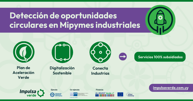 A través de servicios novedosos para el sector productivo uruguayo, Impulsa Verde apoya a las micro, pequeñas y medianas empresas (Mipymes) abordando los conceptos de Economía Circular y Simbiosis Industrial desde distintos aspectos de la gestión empresarial, fomentando la adopción de productos, procesos productivos y modelos de negocio respetuosos con el ambiente. Con el apoyo de expertos, hasta el momento más de 30 empresas han obtenido planes de acción a medida que les permitieron identificar prácticas circulares y asociativas en su producción.
