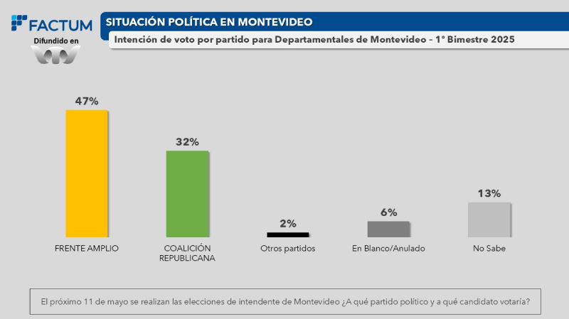 Una nueva encuesta de Factum reveló que el 55% de los montevideanos desaprueba la gestión del Frente Amplio (FA) en la Intendencia, mientras que el 40% la aprueba. En base a las expectativas previas, el estudio arrojó que el 67% cree que la gestión fue inferior a lo esperado o no tenía expectativas, mientras que el 31% la consideró acorde o mejor de lo esperado. De todas maneras, el 47% tiene la intención de votar al FA y el 32% a la Coalición Republicana (CR).