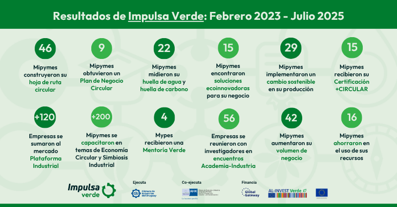 Después de 30 meses de ejecución, el proyecto Impulsa Verde de la Cámara de Industrias del Uruguay (CIU), finaliza con éxito sus servicios diseñados a medida de las micro, pequeñas y medianas industrias uruguayas. El proyecto acercó capacidades técnicas novedosas en el sector, facilitando la implementación de prácticas circulares en productos y procesos productivos de las empresas.
