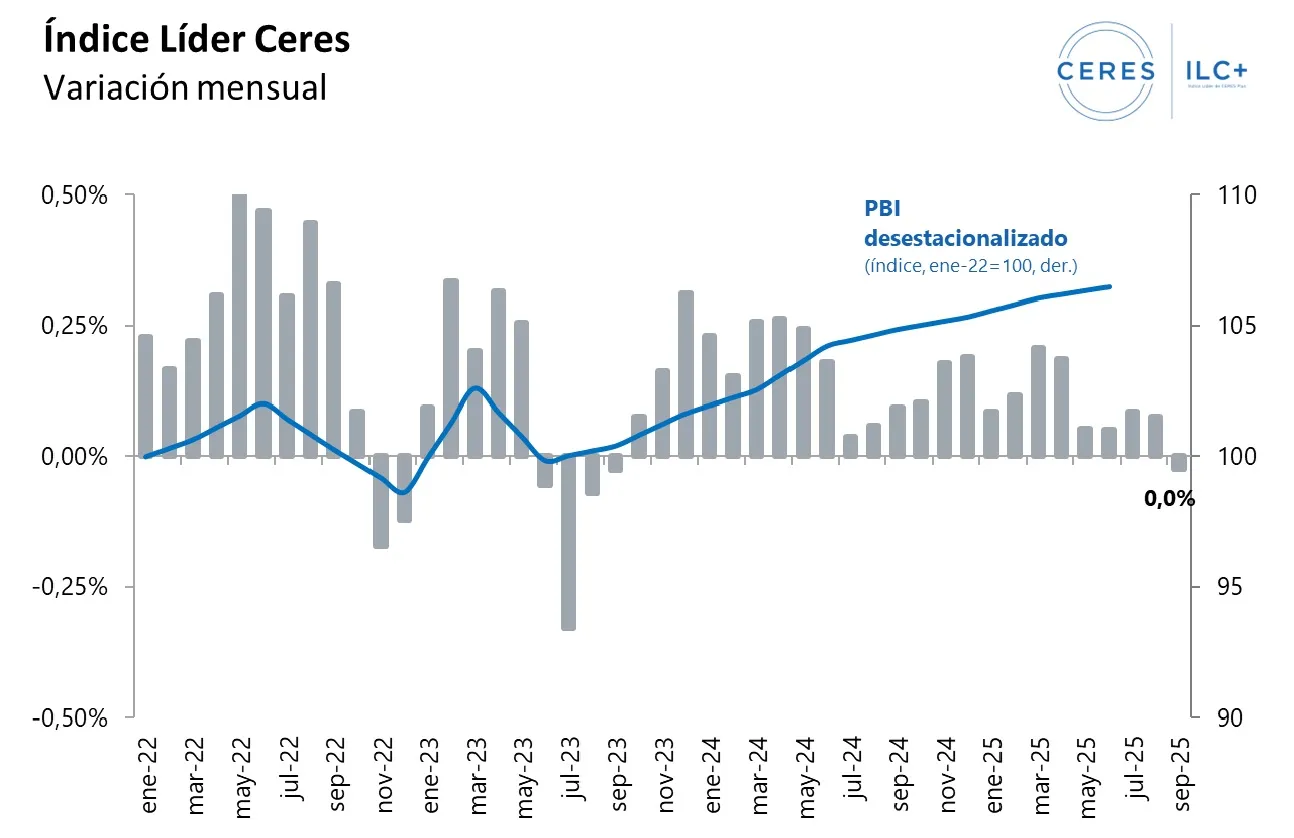 El Índice Líder de Ceres (ILC) registró en setiembre una leve baja de 0,02%, lo que marca su primera tasa negativa del año y corta con 13 meses consecutivos de incremento. “La desaceleración primero y esta tasa neutra en setiembre, son señales de cierto enfriamiento de la economía, aunque habrá que esperar los datos de meses siguientes para verificar una tendencia”, explica el informe publicado por Ceres.