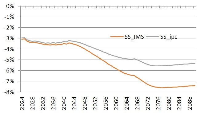 Las proyecciones actualizadas del Observatorio muestran que aun en el caso de ajustar los parámetros del suplemento solidario de acuerdo a la evolución del IPC, se espera una trayectoria creciente del déficit previsional, que demandaría a largo plazo algo más de 2 puntos porcentuales del PIB adicionales de financiamiento. En el caso de que los gobiernos opten por no disminuir la importancia del suplemento solidario, ajustando sus parámetros de cálculo considerando la evolución del IMS, el deterioro del déficit del sistema sería claramente más pronunciado, demandando a largo plazo más de 4 puntos porcentuales del PIB adicionales para su financiamiento.