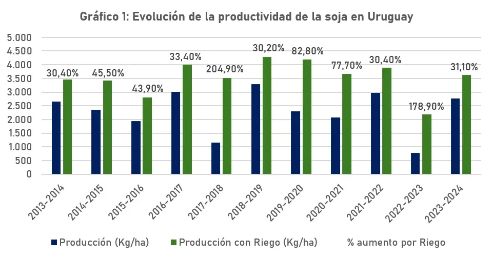 En el Gráfico 1 se muestra la evolución de la productividad de la soja de primera zafra en Uruguay durante la última década, comparando los rendimientos de los sistemas con y sin riego, así como el aumento porcentual entre ambos. En todos los ciclos agrícolas, el riego mejora significativamente la producción, aunque su efecto es especialmente visible en los años más secos.