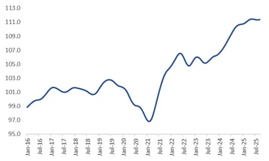 El comportamiento del nivel tendencial de la actividad económica correspondiente a los primeros nueve meses del año se ubica 2,6% por encima de la tendencia de esos mismos meses de 2024. Los datos disponibles evidencian que tanto la desaceleración del crecimiento como el incipiente cambio de signo, habrían tenido lugar durante el tercer trimestre.