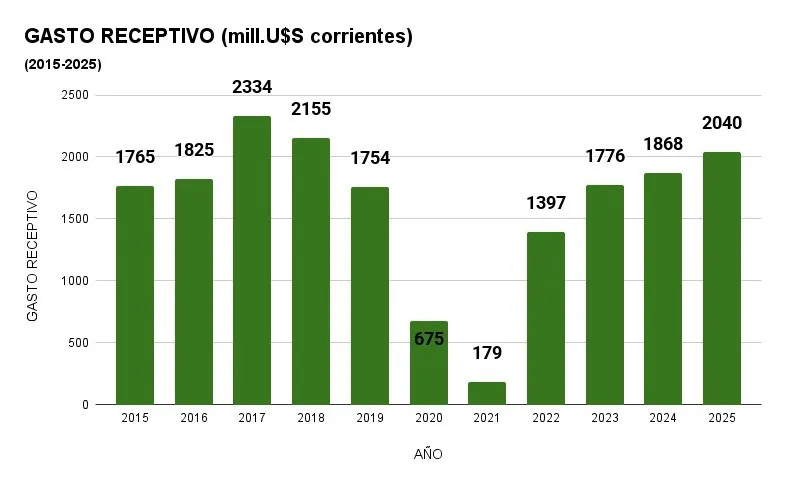 En cuanto al impacto económico, el gasto turístico total creció un 16,6% en relación con 2024. Asimismo, el gasto promedio por persona aumentó un 8,1% respecto al año anterior, mostrando una mejora en el nivel de consumo de los visitantes. Al analizar el gasto promedio por persona en su estadía según nacionalidad, se observa que los paraguayos registran un gasto de US$ 1.163, seguidos por los europeos, con un promedio de US$ 836, y los norteamericanos, con alrededor de US$ 799. A continuación se encuentran los chilenos, con US$ 760; los brasileños, con US$ 731; y los argentinos, con US$ 516. Finalmente, los visitantes uruguayos presentaron un gasto promedio de aproximadamente US$ 353.